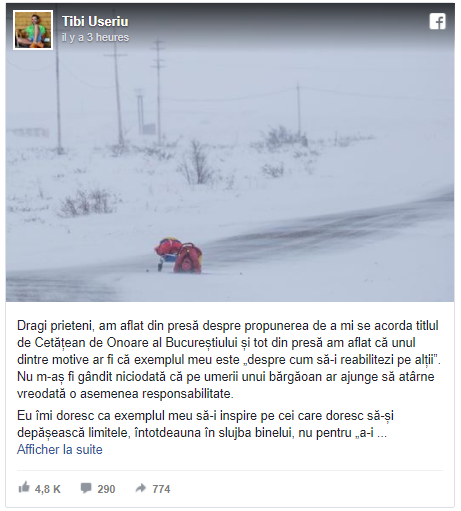 „Dragi prieteni, am aflat din presă despre propunerea de a mi se acorda titlul de Cetățean de Onoare al Bucureștiului și tot din presă am aflat că unul dintre motive ar fi că exemplul meu este „despre cum să-i reabilitezi pe alții”. Nu m-aș fi gândit niciodată că pe umerii unui bărgăoan ar ajunge să atârne vreodată o asemenea responsabilitate. Eu îmi doresc ca exemplul meu să-i inspire pe cei care doresc să-și depășească limitele, întotdeauna în slujba binelui, nu pentru „a-i reabilita pe alții”. Dacă în Consiliul General se va vota acordarea acestui titlu, nu îl voi refuza, din respect pentru toți bucureștenii, dar nu mă voi prezenta la ceremonia de decernare și nici la alte festivități. Le mulțumesc celor care s-au gândit să-mi acorde această distincție și tuturor celor care cu gândurile lor bune m-au susținut în timpul ultimei competiții”, a explicat ultramaratonistul.
