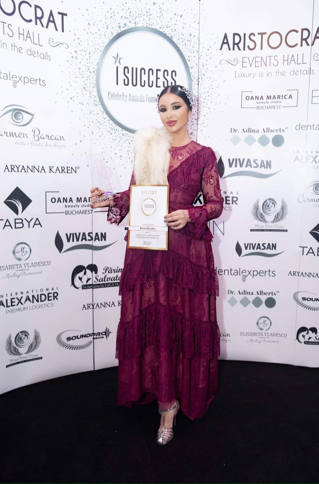 În decembrie 2019, în cadrul Galei I Success Celebrity Awards- Femei de Succes, a fost răsplătită cu premiul de excelență pentru dezvoltarea talentelor din România, reprezentând momentul cel mai strălucit din cariera sa. Câștigarea titlului ce-l poartă cu bucurie mare reprezintă confirmarea muncii care a fost permanent mână în mână cu ambiția și seriozitatea Elenei, fondatoarea Academiei de Talente Elena Gondoș. Este un exemplu viu de reușită ce îmbină armonios cele două lumi în care se învârte, care, după ani de studiu intens a decis să se lase condusă de pasiune și nu doar. Împărtășește din tainele sale și celor ce îi trag pragul școlii de muzică pe care o conduce încă de la vârsta la care unele fete nici nu îndrăzneau să viseze. Nu s-a lăsat deznădăjduită de nimic și de 7 ani povestea visului său se scrie. Personajele ce au rol principal sunt toți cei care declară că muzica nu trebuie să fie limitată de vârstă, pregătire sau statut social, după cum este și în accepțiunea Elenei.